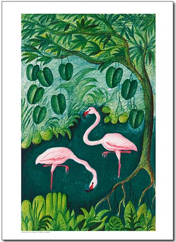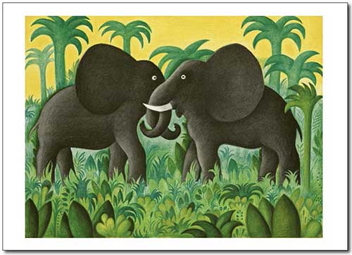 To flotte tapirer står i junglen med deres lille unge imellem dem. De er blå og hvide og bag dem er der palmer og andre mørke træer. Foran dem er der vand måske et vandløb…
